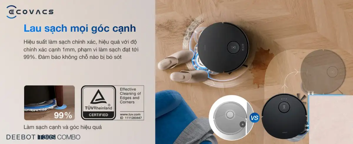 Deebot T30S Combo được trang bị công nghệ TruEdge™ hiện đại, cho phép tấm lau nhà mở rộng liên tục để tiếp cận sát mép tường và các góc nhà. Kết hợp cùng cảm biến nhận thức đa hướng 3D, sản phẩm dễ dàng xử lý các vị trí khó khăn mà các mẫu robot trước đây chưa làm được.