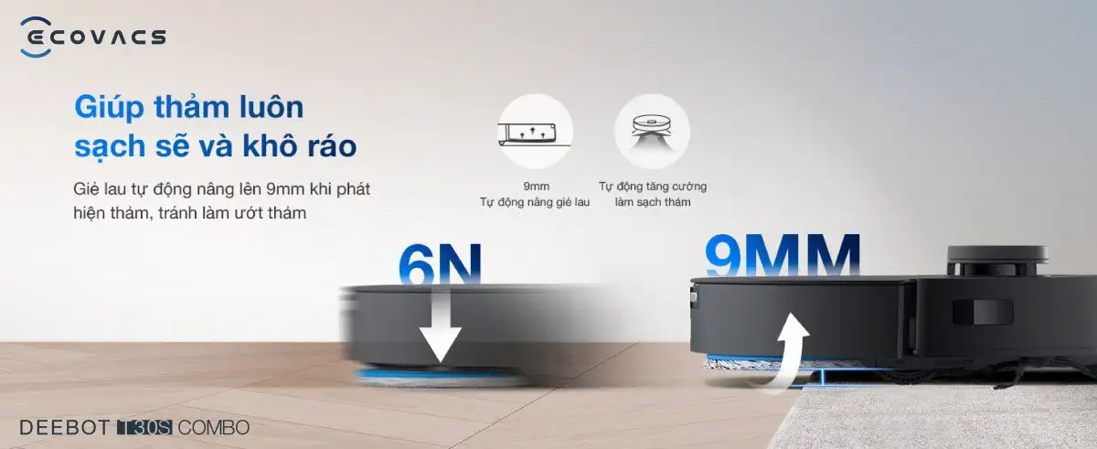Với công nghệ nhận dạng siêu âm, robot có thể tự động nâng giẻ lau lên 9mm khi phát hiện thảm, ngăn ngừa tình trạng ẩm thảm và lây nhiễm chéo.