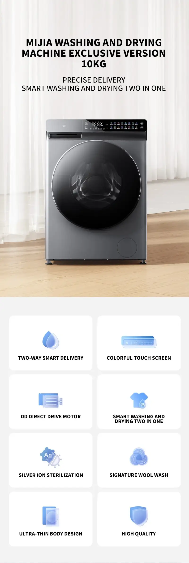 Máy giặt sấy Xiaomi MJ203 được trang bị nhiều công nghệ tiên tiến, trong đó nổi bật là công nghệ khử trùng giúp loại bỏ vi khuẩn và nấm mốc trên quần áo. Điều này đặc biệt quan trọng đối với các gia đình có trẻ nhỏ hoặc người dễ bị dị ứng, đảm bảo sức khỏe và sự an toàn cho người dùng. Ngoài ra, động cơ truyền động trực tiếp (DD) của máy không chỉ hoạt động hiệu quả mà còn giảm thiểu độ ồn, tiết kiệm năng lượng và bền bỉ hơn so với các loại động cơ truyền thống.