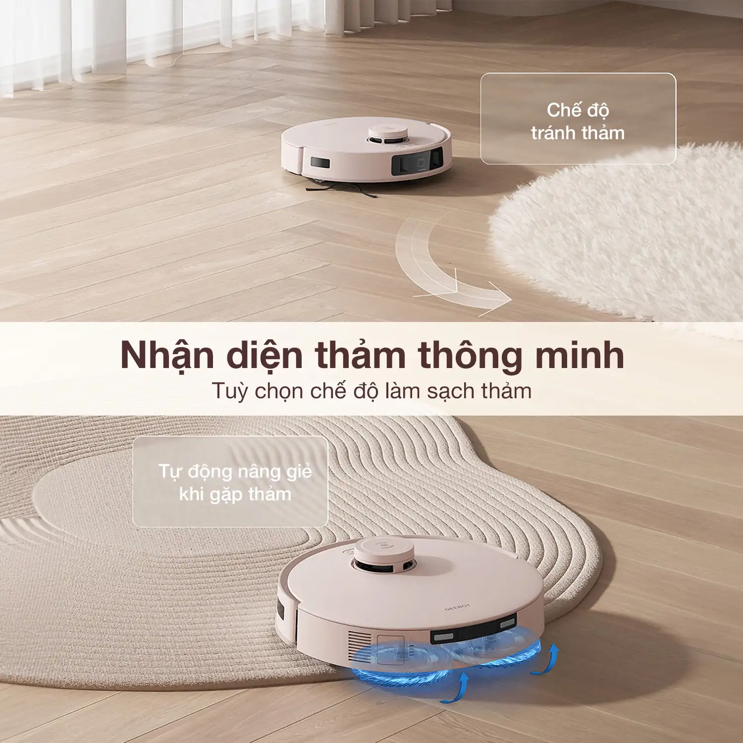 Nhờ cảm biến siêu âm tiên tiến, robot tự động nhận diện thảm và nâng giẻ lau, đảm bảo làm sạch thảm mà không làm ướt. Với pin dung lượng lớn 5.200mAh, robot có thể hoạt động liên tục đến 290 phút, vượt qua chướng ngại cao 20mm, lý tưởng cho căn hộ lớn.